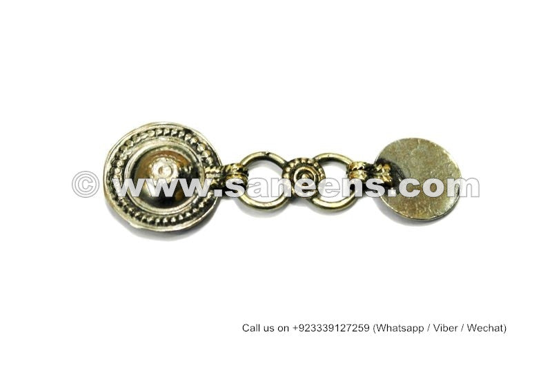 Here are some buttons, made of German silver. These are known as Afghan Kuchi buttons. Mainly these buttons are used for beautifying tribal ethnic costumes dress and tribal jewelry. Almost every tribal jewelry item like belts and necklaces etc, may contain such buttons. Each buttons has a central round piece, some hanging chains ending with bells and a hook on its top. Many belly dancers use such buttons for beautifying their belly dance belts, necklaces, headdresses and ankelts etc accordingly.
