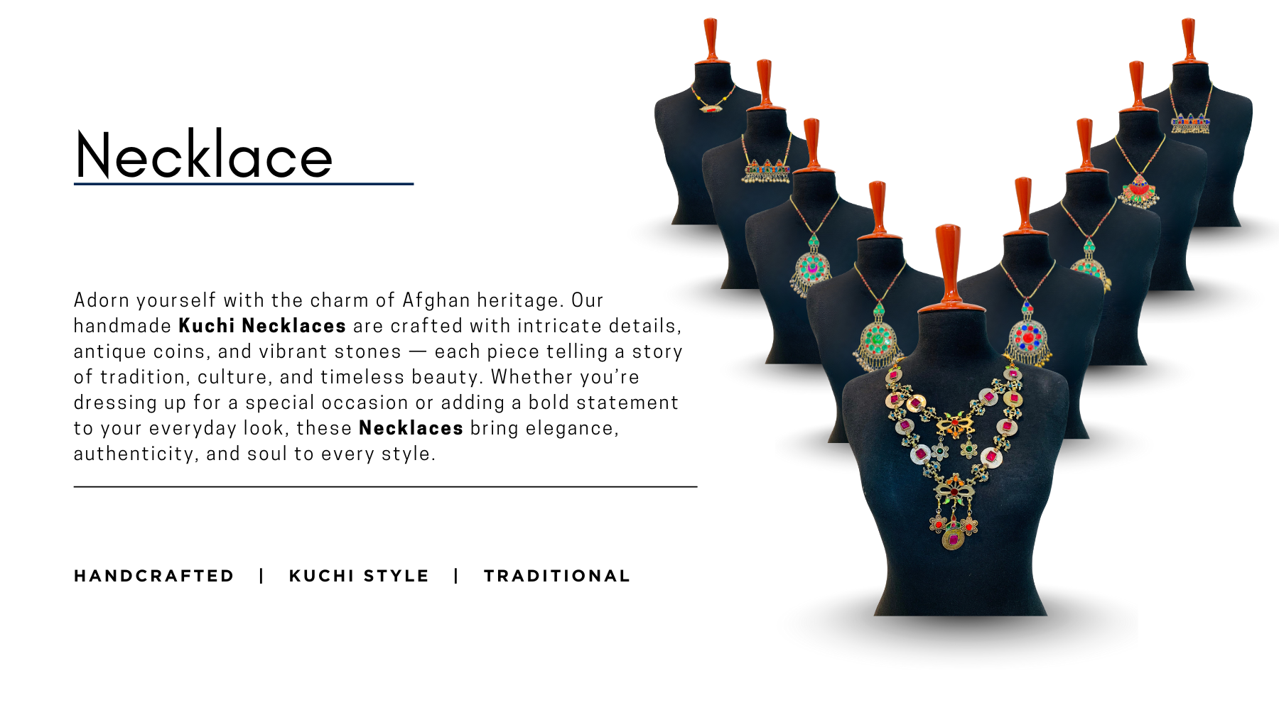 Adorn yourself with the timeless beauty of Afghan Necklaces, handcrafted to reflect the rich cultural heritage of Afghanistan. Featuring vibrant gemstones, intricate metalwork, and traditional tribal designs, these necklaces are more than jewelry — they are statements of identity and artistry. Each piece tells a story of Afghan craftsmanship, making it a meaningful addition to any collection.
